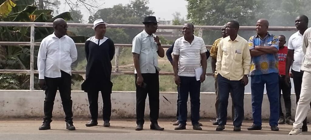 Le Maire YAO Étienne accompagné d’une forte délégation de ses collaborateurs est descendu à nouveau sur le terrain ce samedi 16 décembre 2023, pour toucher du doigt certaines réalités de la ville de Bouaflé en vue d’y apporter des solutions idoines. Il a commencé par une visite à monsieur Sylla, Directeur Régional de la Construction pour s’informer sur le plan d’urbanisation de la ville de Bouaflé. Ensuite cap a été mis successivement sur l’ex hôtel campement dans un état de vétusté avancé, la stèle et la statue de Djela Lou Zaouli en face de la sous-préfecture, les rues du quartier commerce et la gare routière, enfin le centre culturel HKB en plein chantier de réhabilitation. Il faut noter que tous les sites visités sont dans un état d’insalubrité, d’abandon ou de dégradation. Le Maire YAO Étienne a promis assainir la ville, réhabiliter certains sites pour donner un visage digne et reluisant à la commune de Bouaflé dans les semaines à venir. Après toutes ces visites, le maire s’est rendu à ses bureaux à la mairie pour une réunion de Municipalité en prélude du dernier Conseil Municipal de 2023.